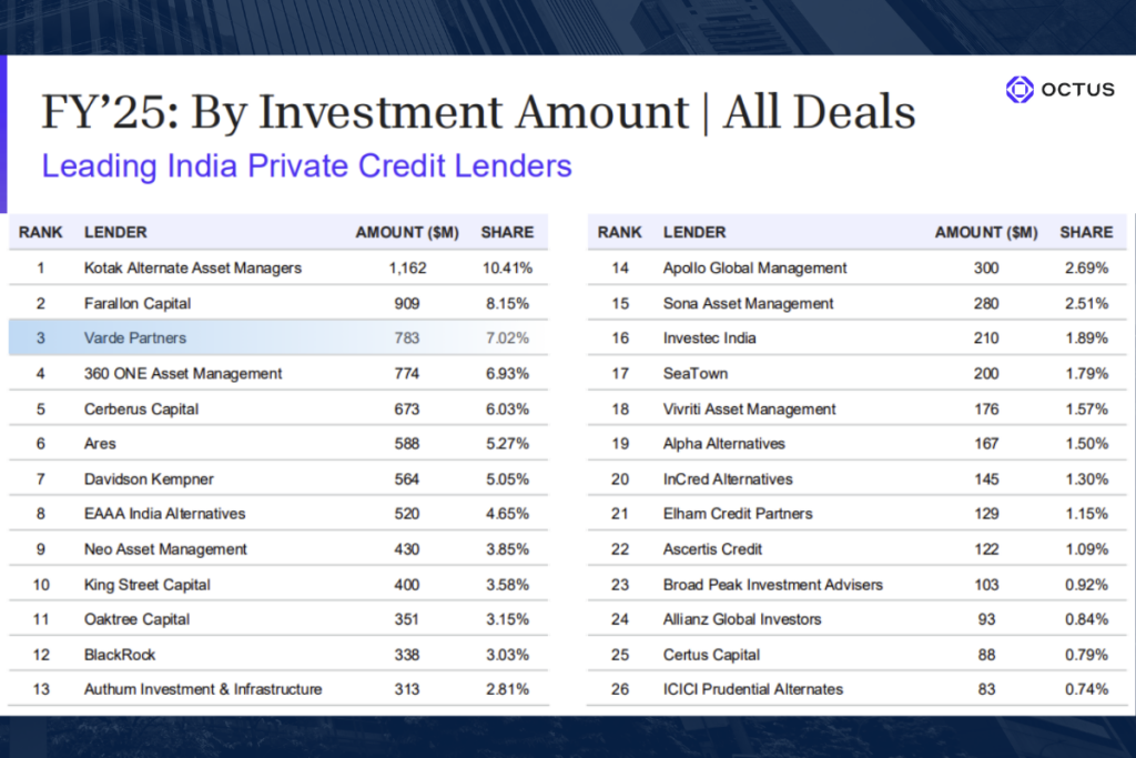 MUMBAI – Värde Partners is pleased to be recognized by Octus as one of the leading private credit lenders in India in 2025. The full report is available here.